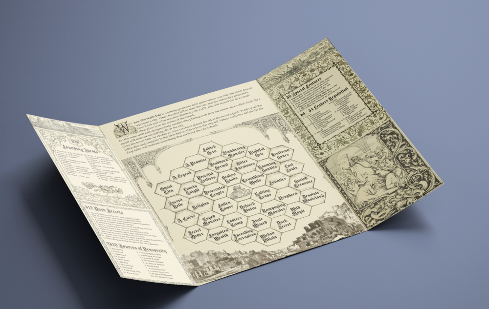 CHG Review: “When The Walls Fall is a charmingly neat little tool/minigame. You can break it out whenever you need to do a bit of worldbuilding, come up with some adventure hooks, or just want to goof around with dice but make it a bit more engaging that just building an altar to Polyhedros, Lord of Dice.”